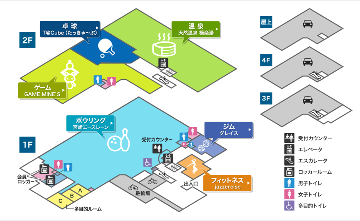 ボウリング場に、癒しの空間の温泉施設、ゲームセンター、フィットネス、お食事処も加わり、ここに「街のオアシス」エースランドが誕生しました。
